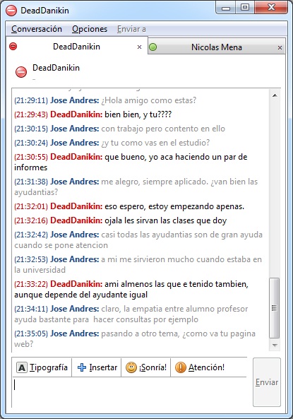 Escogido el protocolo, solo queda usar el programa el cual tiene una interfaz simple con lo justo y necesario para conversar. Al tener más ventanas de conversación, estas se administran en pestañas maximizando el espacio de trabajo.