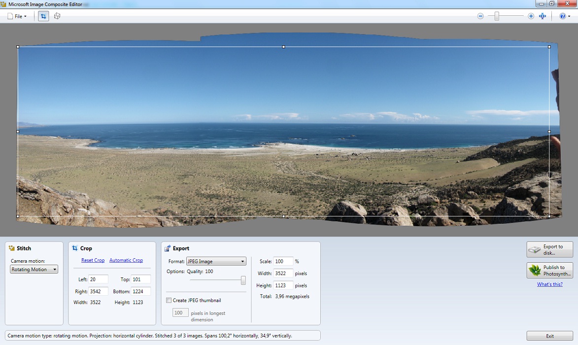 Cuando ya se tiene la imagen ajustada, basta guardarla al computador con el botón Export to disk o también esta la opción de publicarla en Photosynth (requiere instalación extra).