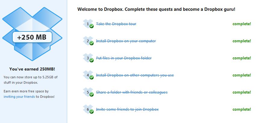Dropbox funciona de manera muy simple mediante una cuenta de usuario, la cual quedara definida para el almacenamiento online que es la forma de hacer la sincronización. Instalado el programa se define una carpeta en la cual se deben dejar los archivos a sincronizar. Todo lo que se ponga en dicha carpeta, Dropbox automáticamente lo subirá a la cuenta online de almacenamiento la cual como se menciono parte en 2 GB, pero siguiendo unos simples pasos esta capacidad va aumentando en 250 MB. Adicionalmente por cada referido que se inscriba mediante un link personal de la cuenta, la capacidad aumenta en otros 250 MB llegando a un máximo gratis de 10 GB. En mi cuenta personal luego de hacer los pasos recomendados y con algunos referidos la capacidad gratis va en 5,25 GB.