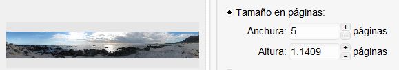 Primero se define el número de páginas a ocupar en anchura o altura. Al ajustar un valor, el otro cambia a fracción ya que muy difícilmente encajaran a la perfección ocupando toda la hoja y casi siempre sobrara un borde. En este ejemplo ajuste a 4 paginas de anchura y se ocupara 0.9 de altura quedando un pequeño borde y como la alineación esta centrada, el borde se repartirá entre la parte superior e inferior de la imagen (casi no se nota, pero lo muestra como un borde gris sobre y bajo la imagen).